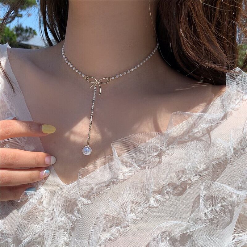 ☆KOREA パールチェーン ネックレス リボン レース ペンダント 真珠 ☆ ゴールド シルバー パール ダイヤモンド エメラルド オパール スパンコール ルビー サファイア ガーネット アクアマリン オニキス 宝石 石 A1035845736204