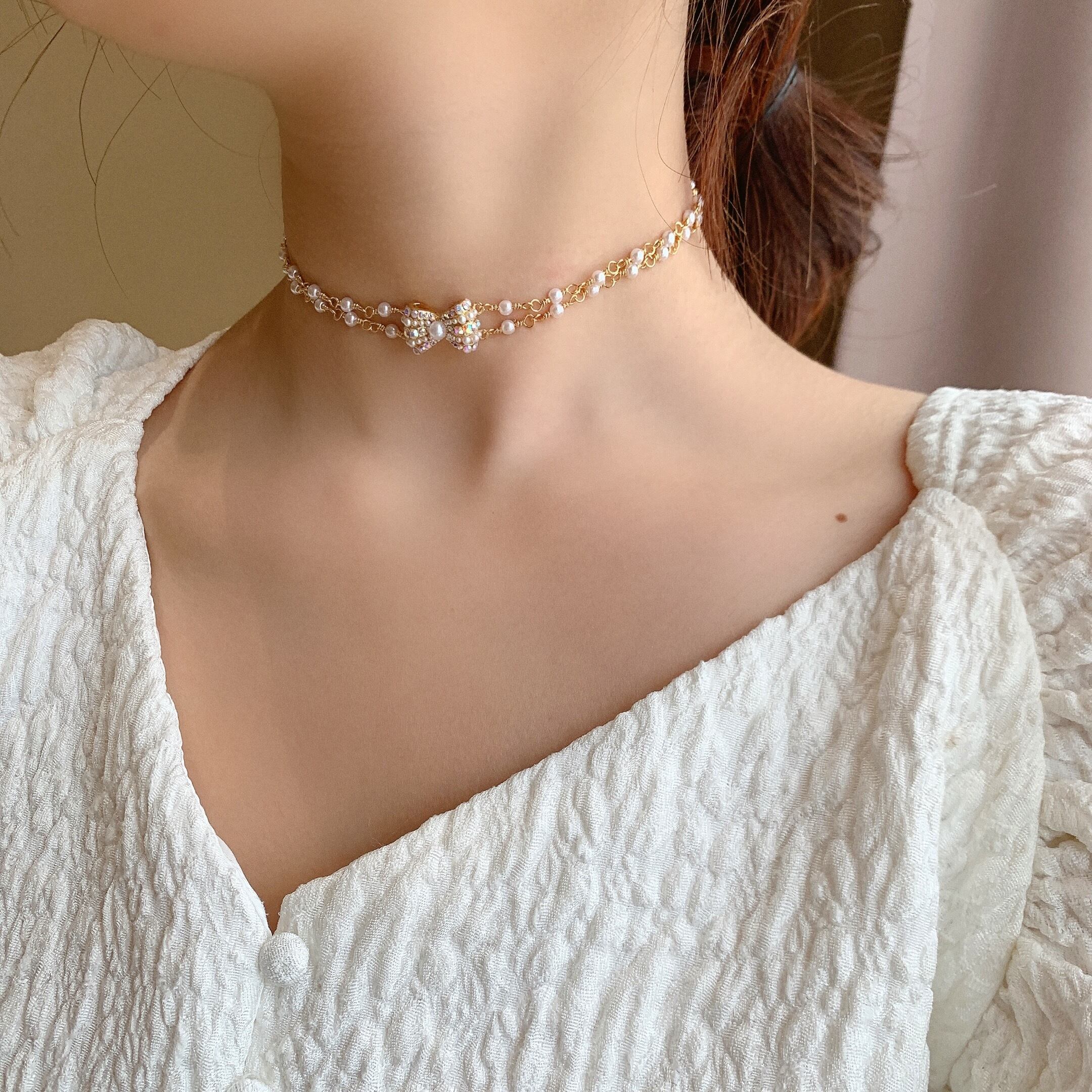 ☆KOREA スプリングパールネックレス チェーン アクセサリー リボン レース 大人ガーリー スウィート キュート カジュアル 春物 真珠 ☆ ゴールド シルバー パール ダイヤモンド エメラルド オパール スパンコール ルビー サファイア ガーネット アクアマリン オニキス 宝石 石 A1060960466231 | fragola