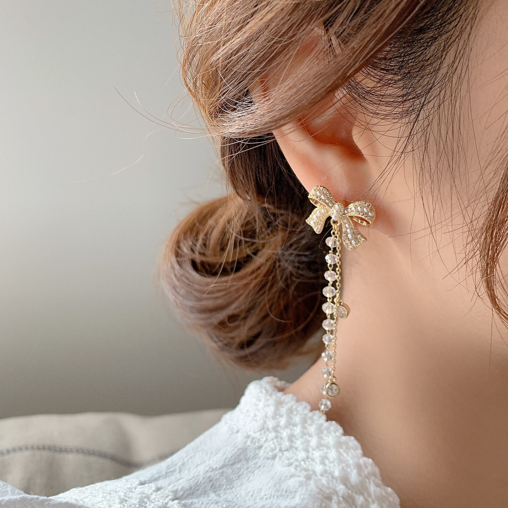 ☆KOREA パールリボンシルバーイヤリング クリスタルロングスタイル 真珠 指輪 銀 ☆ ゴールド シルバー パール ダイヤモンド エメラルド オパール スパンコール ルビー サファイア ガーネット アクアマリン オニキス 宝石 石 A1088927986132 | fragola
