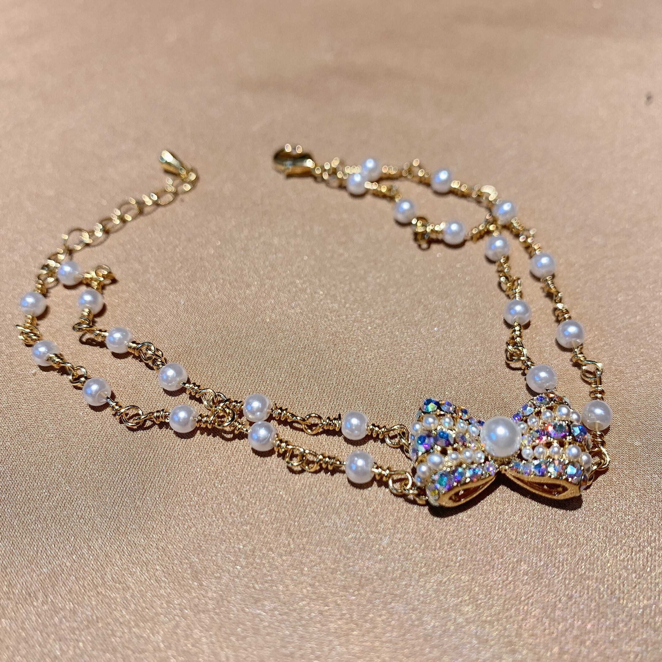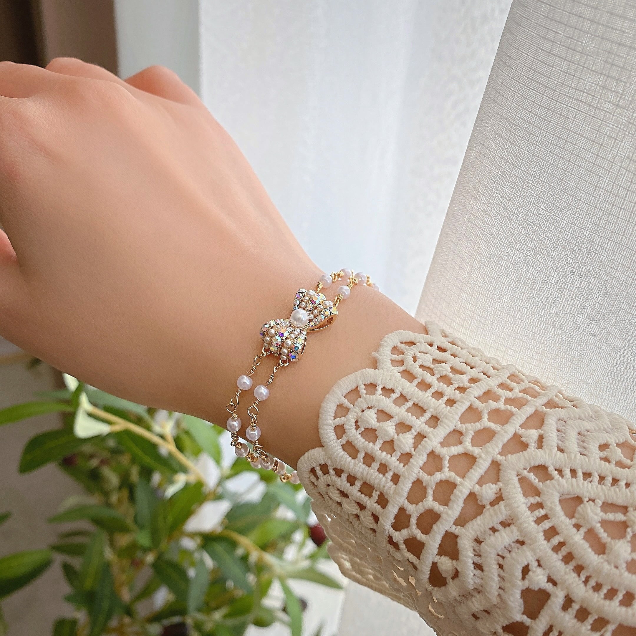 ☆KOREA スプリングパールリボンブレスレット アクセサリー 春物 真珠 ☆ ゴールド シルバー パール ダイヤモンド エメラルド オパール スパンコール ルビー サファイア ガーネット アクアマリン オニキス 宝石 石 A1017823972954 | fragola